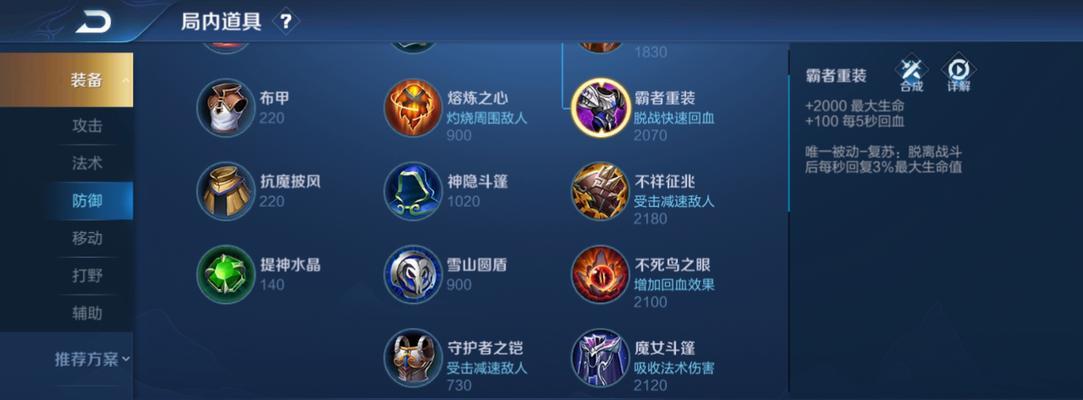 程咬金出装时的首选装备之一就是守护之铠,这件装备不仅提供了大量的生命值和物理防御,更重要的是其被动技能“守护”可以有效降低受到的伤害,并提供额外的吸收护盾,极大增加了程咬金的生存能力。